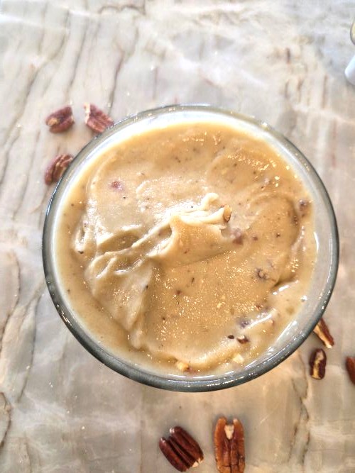 - NOTE : Blend frozen bananas if you have a Vitamix or Blendtec, or other powerful blender. If your blender is not powerful, let bananas become soft then blend with alternative milk and salt. Then add pecans and freeze.