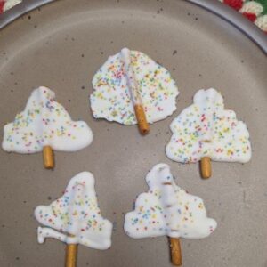 Pretzels and white chocolate – and create these cute Christmas white trees with Watkins sprinkles.
