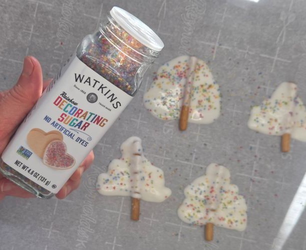 • While the white chocolate is still warmish – add Watkins sprinkles.